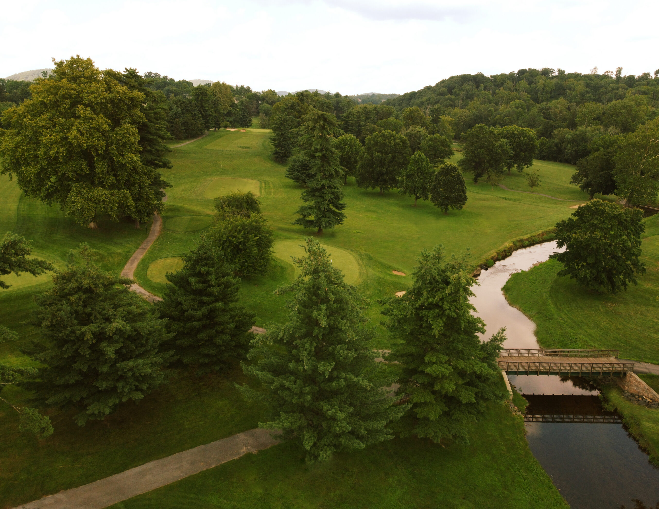 The final par 3 at Reading Country Club plays dramatically from an elevated tee down to a green set beyond a stream. Picturesque trees frame the hole along the sides and behind the putting surface, creating a beautiful yet demanding target.
