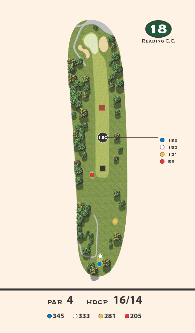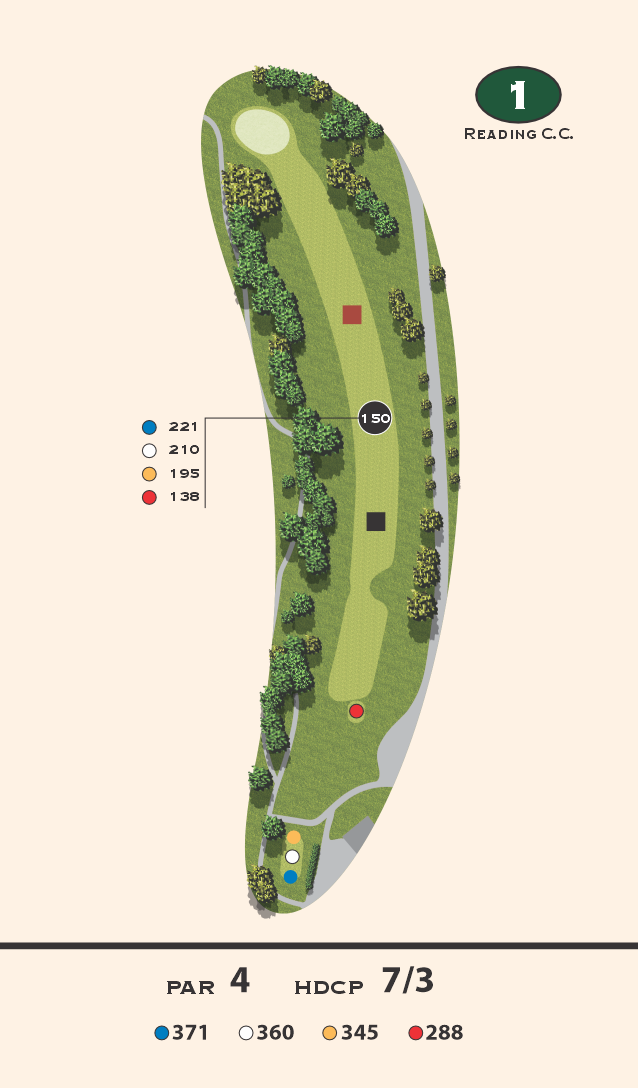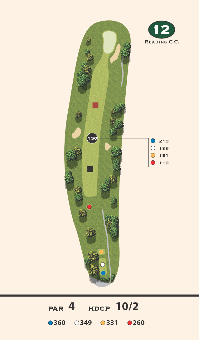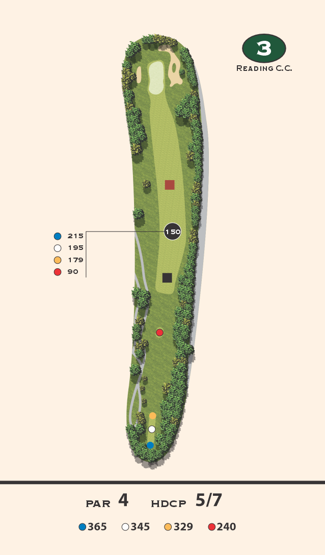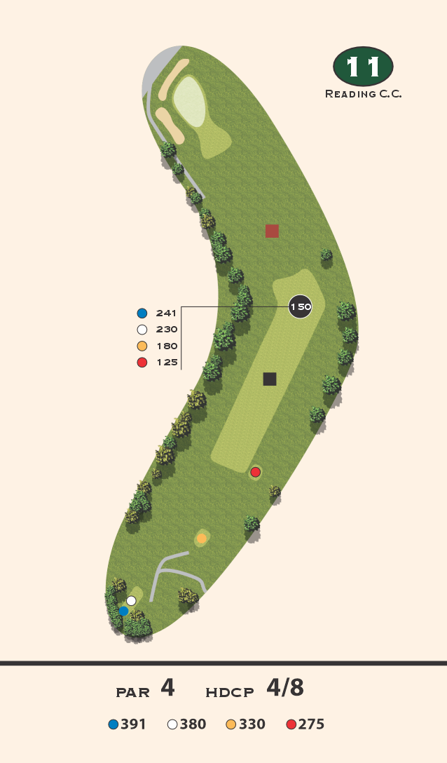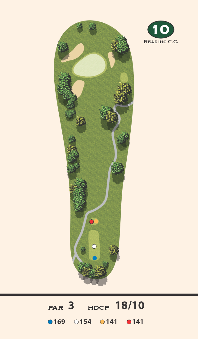 Located just in front of the clubhouse, Hole 10 offers a classic par 3 that showcases the elegance of Reading Country Club. Playing to Findlay’s restored green, the hole demands a precise tee shot rather than power. The putting surface is thoughtfully and strategically bunkered, rewarding accuracy while remaining fair. Framed by a beautiful cluster of mature trees, the green provides a serene yet exacting target. Clean contact and confident distance control are the keys to securing par on this refined and welcoming hole.