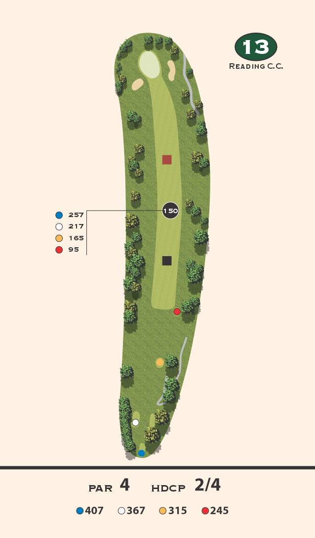 Hole 12 plays across a stretch of former pastureland and through a scenic apple orchard, offering a wide and inviting fairway off the tee. While the opening shot feels generous, the hole quickly reveals its challenge on the approach. Strong players can reach the green with a well-placed second shot, but accuracy and distance control are essential. At 360 yards, this par 4 remains one of the more demanding tests on the course, balanced beautifully by its pastoral setting and the pure enjoyment it delivers from tee to green.