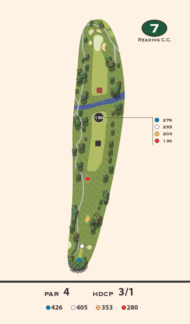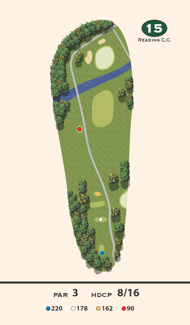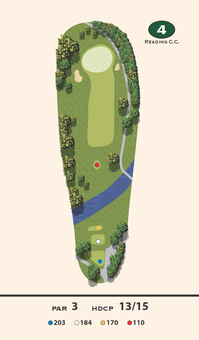 The final par 3 at Reading Country Club plays dramatically from an elevated tee down to a green set beyond a stream. Picturesque trees frame the hole along the sides and behind the putting surface, creating a beautiful yet demanding target.